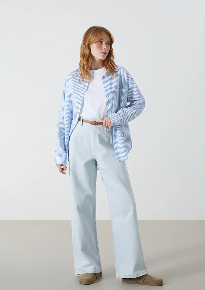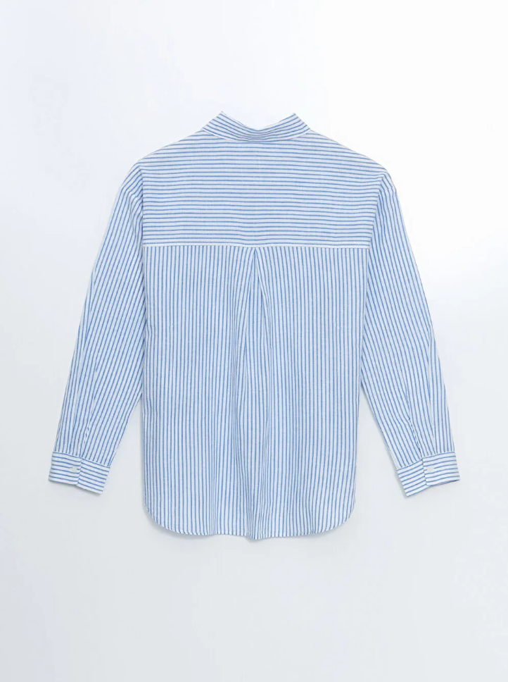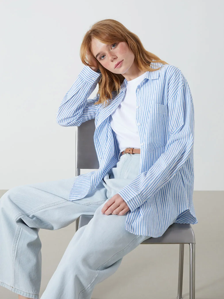 Kadın Oversize Mavi Çizgili Keten Gömlek W Collection