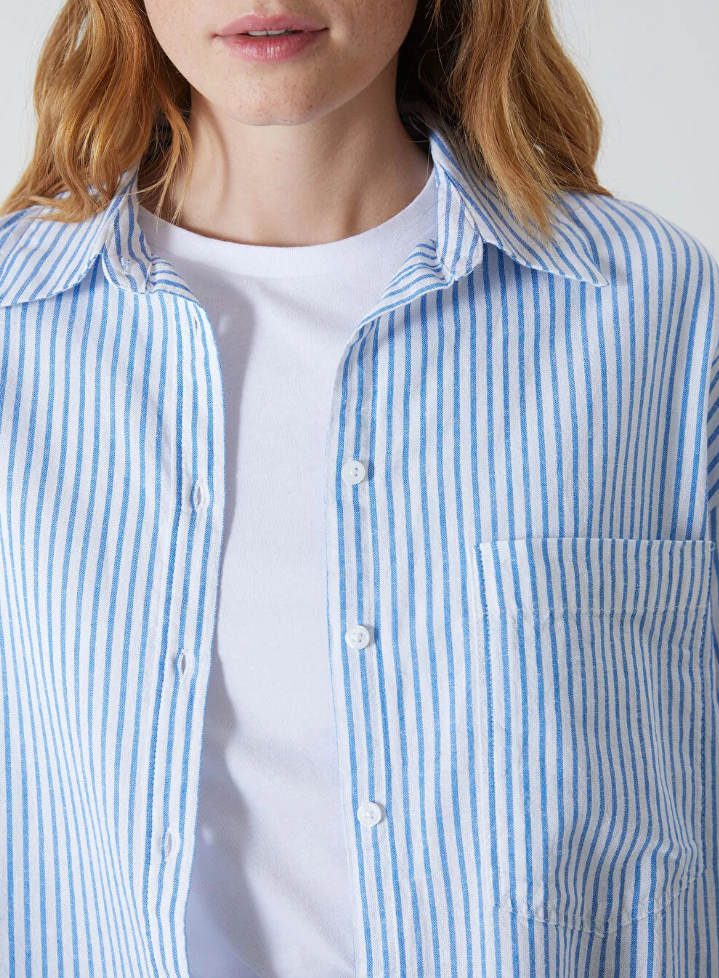 Çizgili uzun kollu oversize keten karışımlı kadın gömlek, rahat ve şık bir görünüm sunar. Hafif ve nefes alabilen keten karışımlı kumaşı, sıcak yaz günlerinde serinlik ve rahatlık sağlar, geniş kesimi ise gün boyu hareket özgürlüğü sunar.