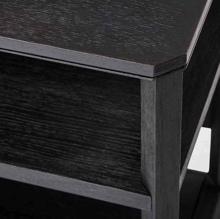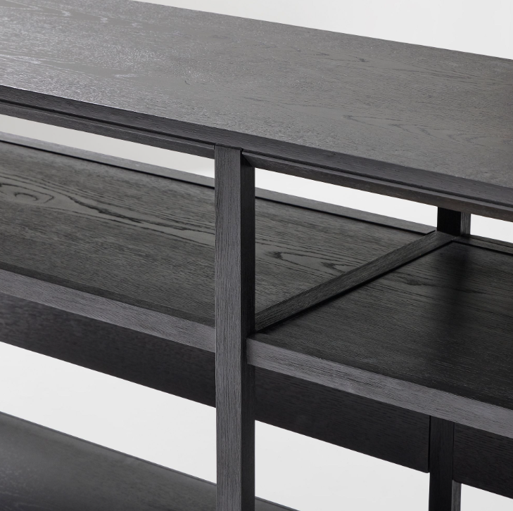 Beyaz meşe kaplama, işlenmiş ahşap üst tabla ve raflar.